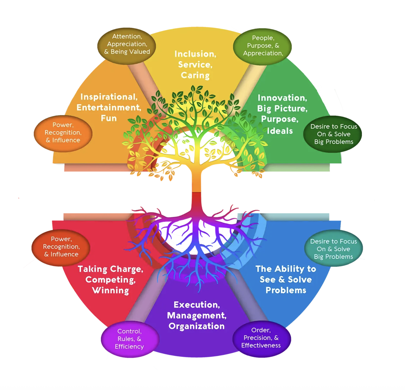 People who value strength get things done, even difficult things. Strength is associated with intelligence, capability, and reliability. People who base their values on strength hold steadfastness, discipline, competence, and confidence in high regard. They value integrity, individual effort, merit, honor, and duty. Strength is represented by the roots of the tree. The roots form a sturdy foundation. They do not dance in the wind like the branches but are unmoving and provide stability. They hold their ground and do the necessary dirty work. The roots provide vital nutrients to sustain the tree and must remain firm to endure the storm.